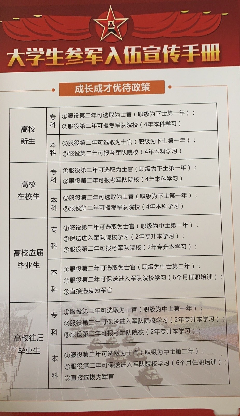 大學(xué)生參軍一般要求具有本科及以上學(xué)歷,對(duì)于??粕糠植筷?duì)也會(huì)根據(jù)實(shí)際需求進(jìn)行招募,需要注意的是,學(xué)歷應(yīng)與報(bào)名兵種和崗位有關(guān)。