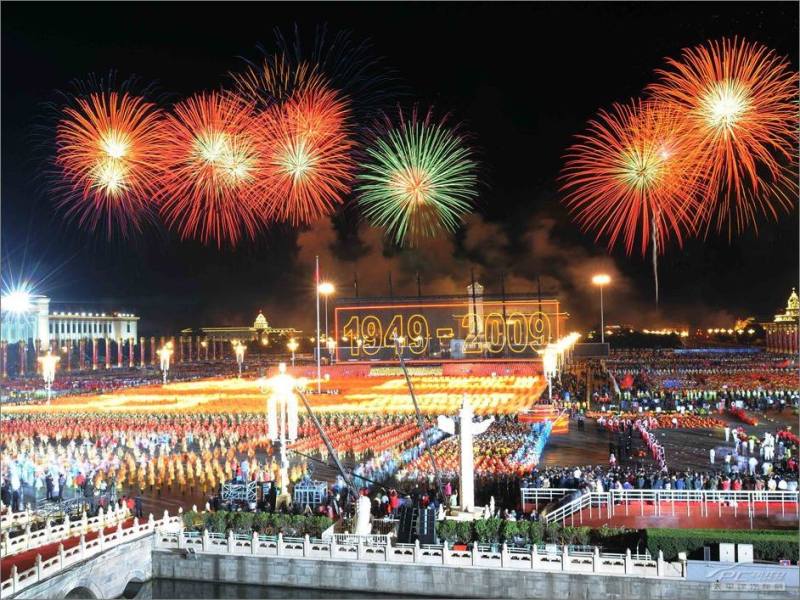 夜晚的煙花表演是國慶慶典的壓軸大戲,五彩斑斕的煙花在空中綻放,猶如盛開的花朵,為慶祝新中國成立60周年增添了濃厚的節(jié)日氛圍。
