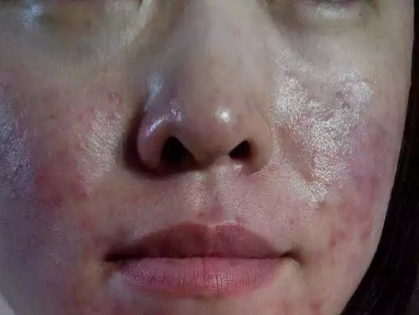 (圖片解析):這張圖片展示了一位激素臉患者的面部情況,可見面部紅腫、干燥,并且有痘痘和粉刺的問題。