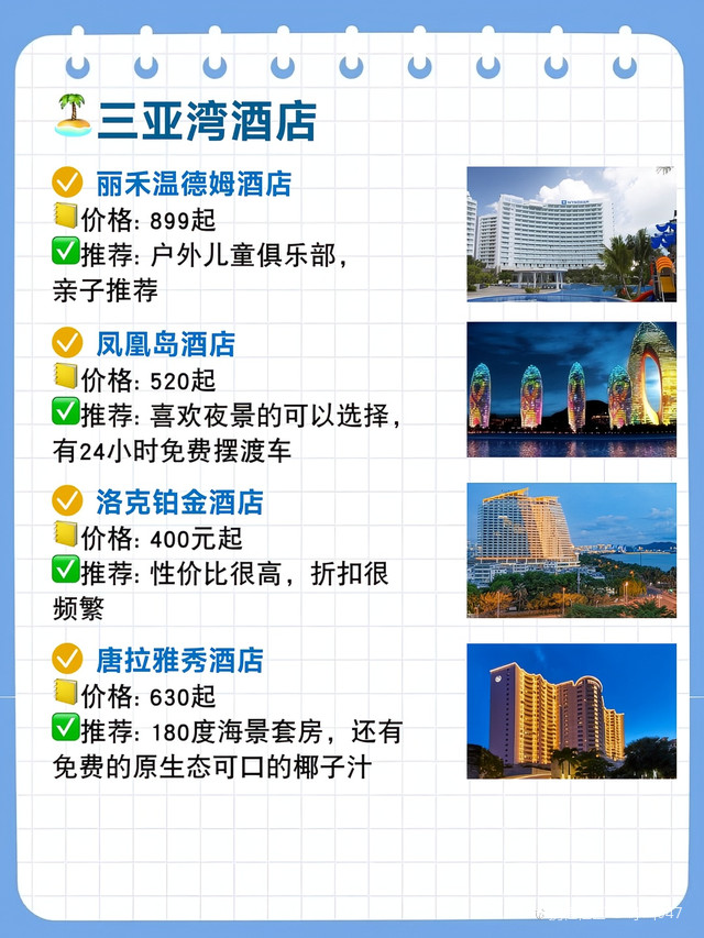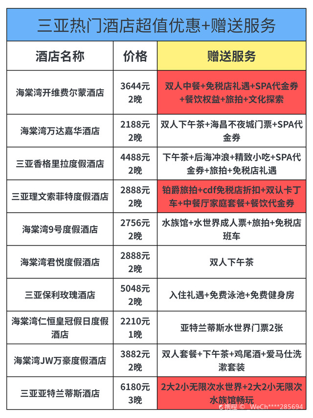 五星級房間:每晚800元至2500元人民幣不等,特色:熱帶花園、兒童俱樂部和豐富的水上活動,4. 三亞香格里拉度假酒店五星級房間:每晚1200元至3500元人民幣不等,特色:位于三亞灣,擁有私人海灘、豪華泳池和水療中心,5. 三亞亞龍灣鉑爾曼度假酒店五星級房間:每晚900元至3000元人民幣不等,特色:法式風(fēng)情度假酒店,提供多種餐飲選擇和水上樂園,6. 三亞亞龍灣熱帶天堂森林公園酒店五星級至七星級房間:每晚1500元至5000元人民幣不等特色:熱帶主題酒店,擁有叢林探險、玻璃棧道等獨特體驗,7. 三亞亞龍灣人間天堂-鳥巢度假村五星級至八星級房間:每晚2000元至萬元以上人民幣不等特色:獨特的鳥巢主題客房、懸崖餐廳和豐富的戶外探險活動,8. 三亞灣紅樹林酒店五星級房間:每晚18元至人民幣不等特色:大型綜合度假勝地,擁有購物中心、博物館等配套設(shè)施,價格根據(jù)房型和預(yù)訂時間有所變動,以上價格僅供參考,具體價格還需根據(jù)季節(jié)、預(yù)訂時間和房型進(jìn)行確認(rèn),在選擇酒店時,請根據(jù)您的需求和預(yù)算進(jìn)行篩選,除了價格因素外,還可以關(guān)注酒店的設(shè)施、服務(wù)以及客戶評價等方面,建議您在預(yù)訂前查看酒店的官方網(wǎng)站或相關(guān)旅游平臺以獲取最新信息和優(yōu)惠活動,在享受三亞的美麗風(fēng)光的同時,選擇合適的住宿將為您的旅程增添更多樂趣,無論是追求奢華體驗還是經(jīng)濟型住宿的旅客都能找到適合自己的住宿選擇,希望這份三亞酒店價格表能夠幫助您規(guī)劃一次完美的熱帶度假旅行!在您的旅途中享受陽光沙灘、美食文化以及獨特的熱帶風(fēng)情吧!
